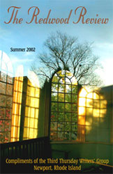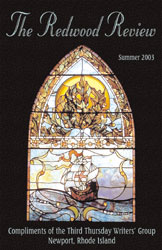 The Redwood Review is a showcase for the work of the Third Thursday Writers Group, which meets at 6 p.m. on the third Thursday of every month at the Redwood Library & Athenĉum. Copies of this periodical are available for free at various locations in the area of Newport, RI. In the spirit of open dialogue and for the love of our craft we welcome comments regarding individual works or authors or the review as a whole. Click here to send compliments or constructive criticism. Organizations that would like to host public readings from the review are also encouraged to contact the writers group. We would like to thank Susan Ryan for the leadership that she provides at each of our meetings. Our group would not be the success that it is without her involvement. We also thank the staff of the Redwood Library for hosting our meetings and for not throwing books at us when we run a little late. |